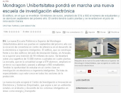 Hona gure eraikin berriaren inguruko artikulua. Eraikin berri hontan informatika, telekomunikazioak eta elektronikako injinerutzako graduko eta masterretako ikasketak emango dira 2010etik aurrera. Gure bulegoak eta laborategiak ere bertan izango dira.